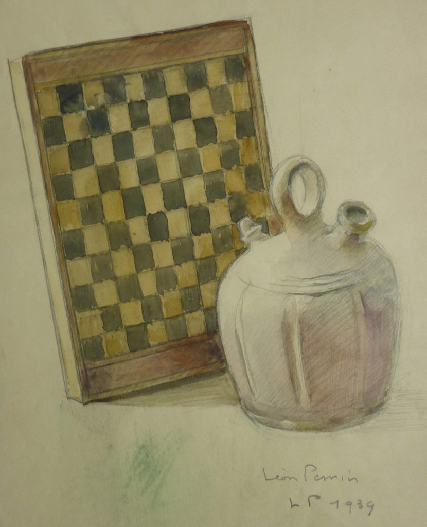Nature morte avec échiquier en bois et gourde en terre cuite d’Espagne - 1939