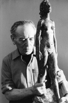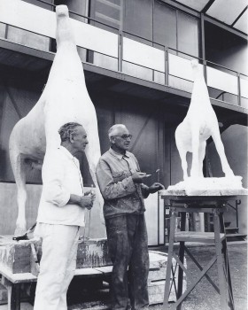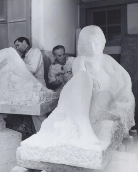 Perrin aux côtés du fondeur Gandini à la fonderie Brotal (Mendrisio, Tessin) devant La Rue (Monument aux Ecoles) – photo Pedroli - 1959