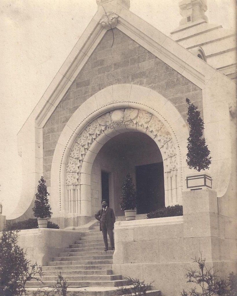 Perrin devant le porche sculpté du Crématoire (La Chaux-de-Fonds) – photo anonyme - 1910